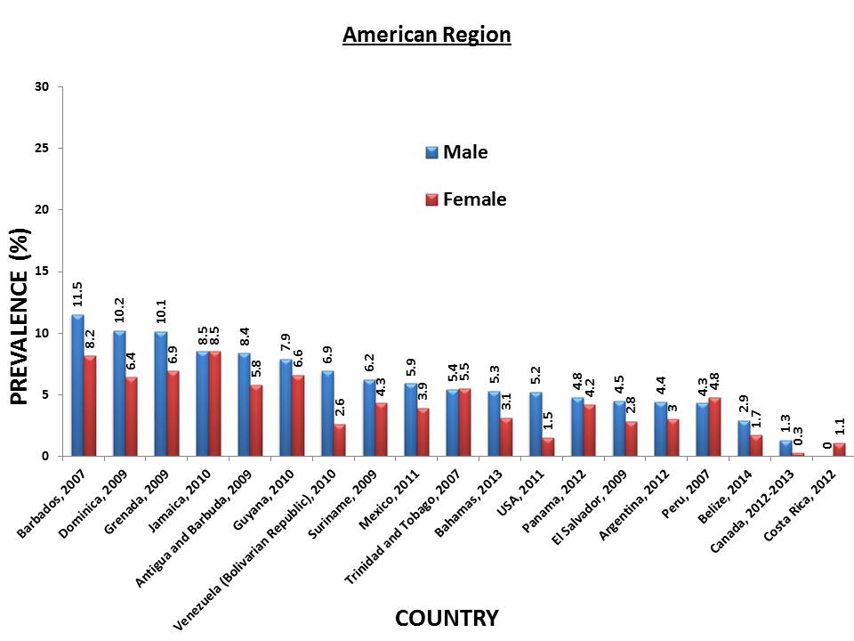 In American Region, prevalence of SLT use among males was highest in Barbados(11.5%) and lowest in Costa Rica(0%) and among females, the prevalence of SLT use was highest in Jamaica(8.5%) and lowest in Canada(0.3%). Prevalence was higher among males in most of the countries of American Region, however, it was either equal or higher among females in Jamaica, Trinidad and Tobago, Panama, Peru and Costa Rica.