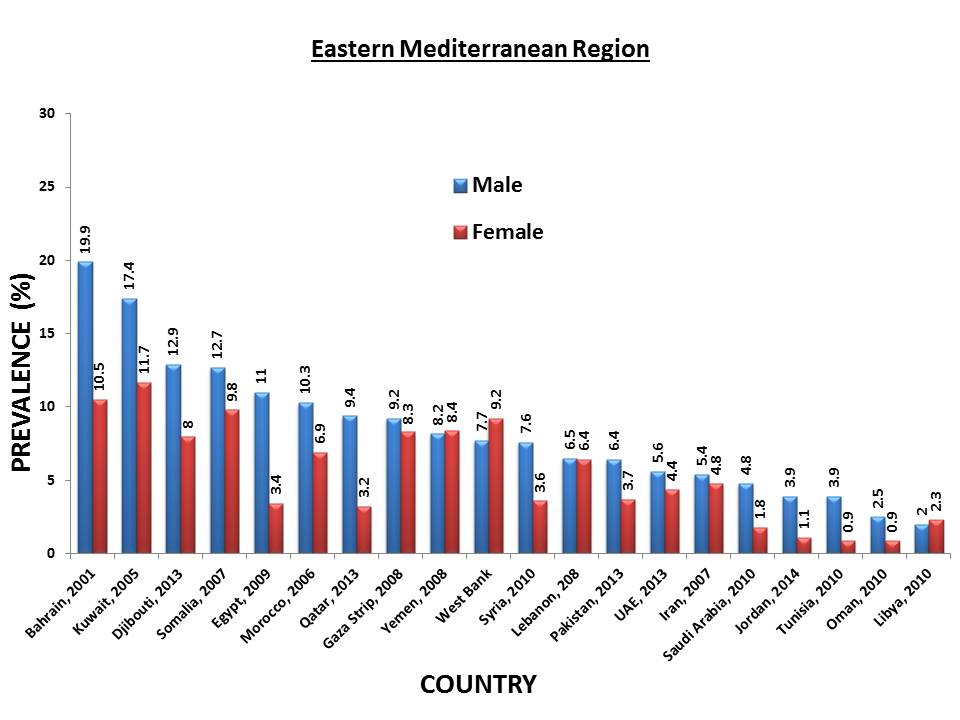 In Eastern Mediterranean Region, prevalence of SLT use among males was highest in Bahrain(19.9%) and lowest in Libya(2%) and among females, the prevalence of SLT use was highest in Kuwait(11.7%) and lowest in Tunisia and Oman(0.9%). Prevalence was higher among males in most of the countries of Eastern Mediterranean Region, however, it was either equal or higher among females in Yemen, West Bank, Lebanon and Libya.
