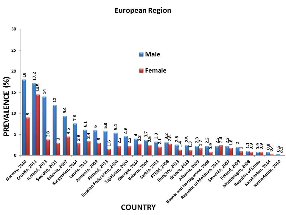 In European Region, prevalence of SLT use among males was highest in Norway(18%) and lowest in Netherlands(0.3%) and among females, the prevalence of SLT use was highest in Croatia(14.5%) and lowest in Netherlands(0.1%). SLT use was higher among males in most of the countries in European Region, however, the prevalence was either equal or higher among females in Republic of Moldova, Montenegro, Republic of Korea, Kazakhstan and Netherlands.