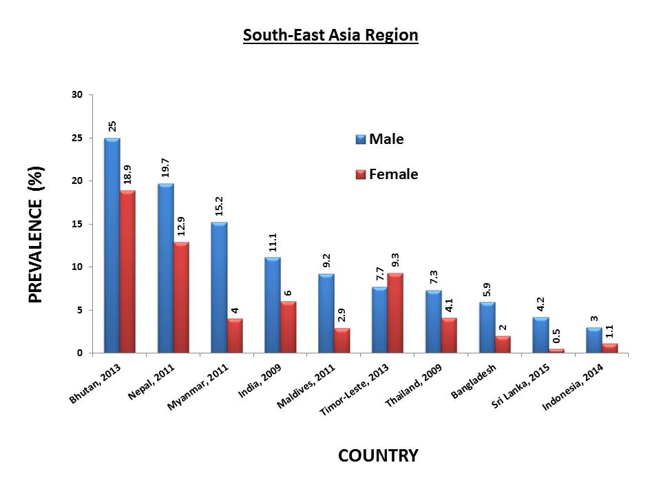 In South-East Asia Region, SLT use among males was highest in Bhutan(25%) and lowest in Indonesia(3%) and among females, highest in Bhutan(18.9%) and lowest in Sri Lanka(0.5%). SLT use was higher among males in 10 countries of South-East Asia Region, however, in Timor-Leste, SLT use was higher among females.
