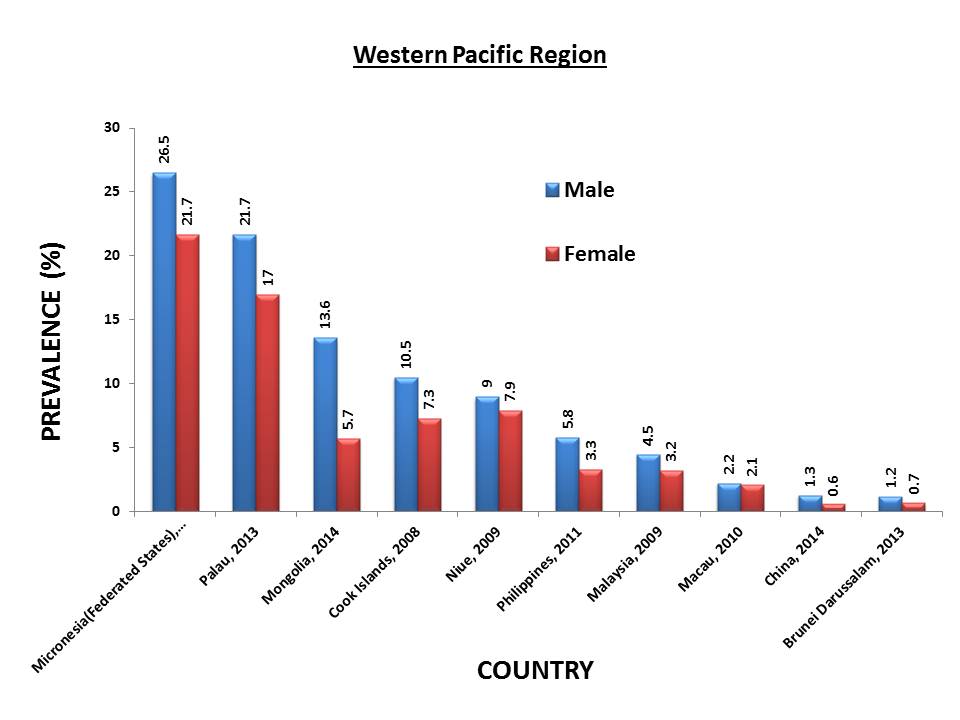 In Western Pacific Region, prevalence of SLT use among males was highest in Micronesia(26.5%) and lowest in Brunei Darussalam(1.2%) and among females, highest in Micronesia(21.7%) and lowest in China(0.6%). SLT use was higher among males in all countries except Macau where the prevalence was either equal or higher among females.