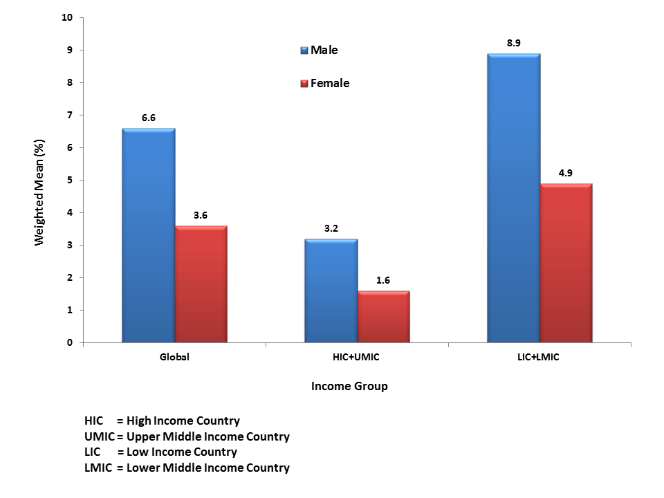 It was observed that overall 6.6% male students (boys) and 3.6% female students (girls) used Smokeless Tobacco(SLT). Boys were significantly more likely to use SLT than girls in Low Income Country(LIC) and Lower Middle Income Country(LMIC) group(8.9% boy vs 4.9% girl) as well as High Income Country(HIC) and Upper Middle Income Country(UMIC) group(3.2% boy vs 1.6% girl) (p<0.001).