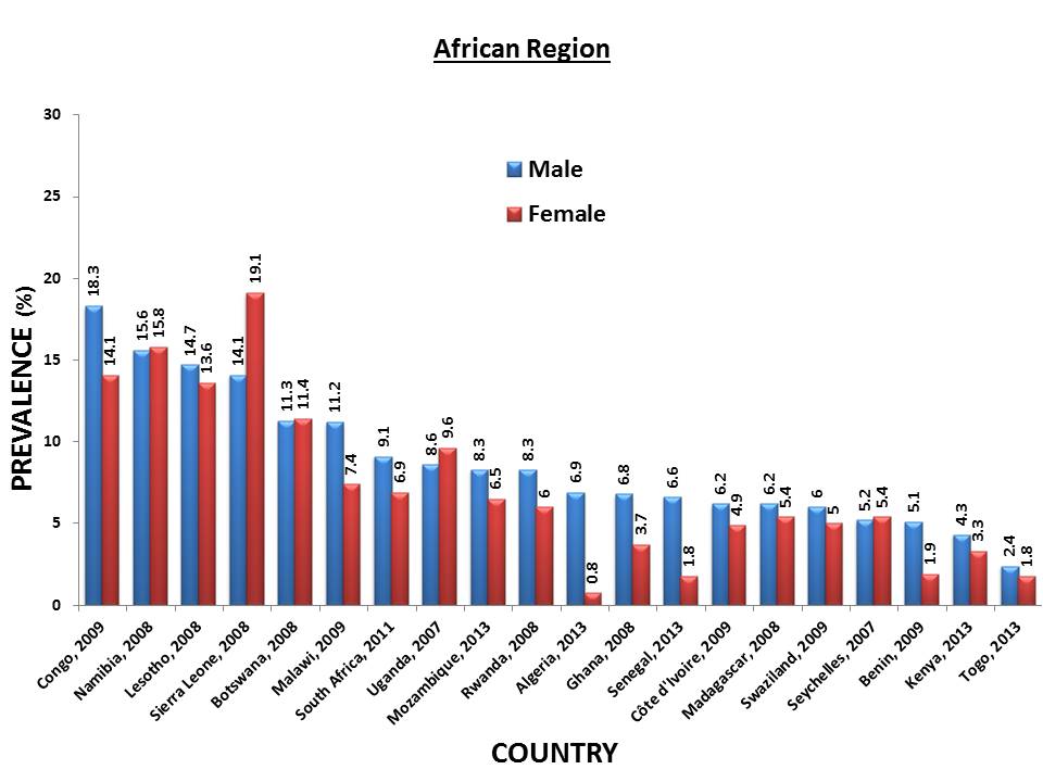 In African Region, prevalence of Smokeless Tobacco(SLT) use among males was highest in Congo(18.3%) and lowest in Togo(2.4%) and among females, the prevalence of SLT use was highest in Sierra Leone(19.1%) and lowest in Algeria(0.8%). Prevalence was higher among males in most of the countries of African Region, however, it was either equal or higher among females in Yemen, West Bank, Lebanon and Libya.